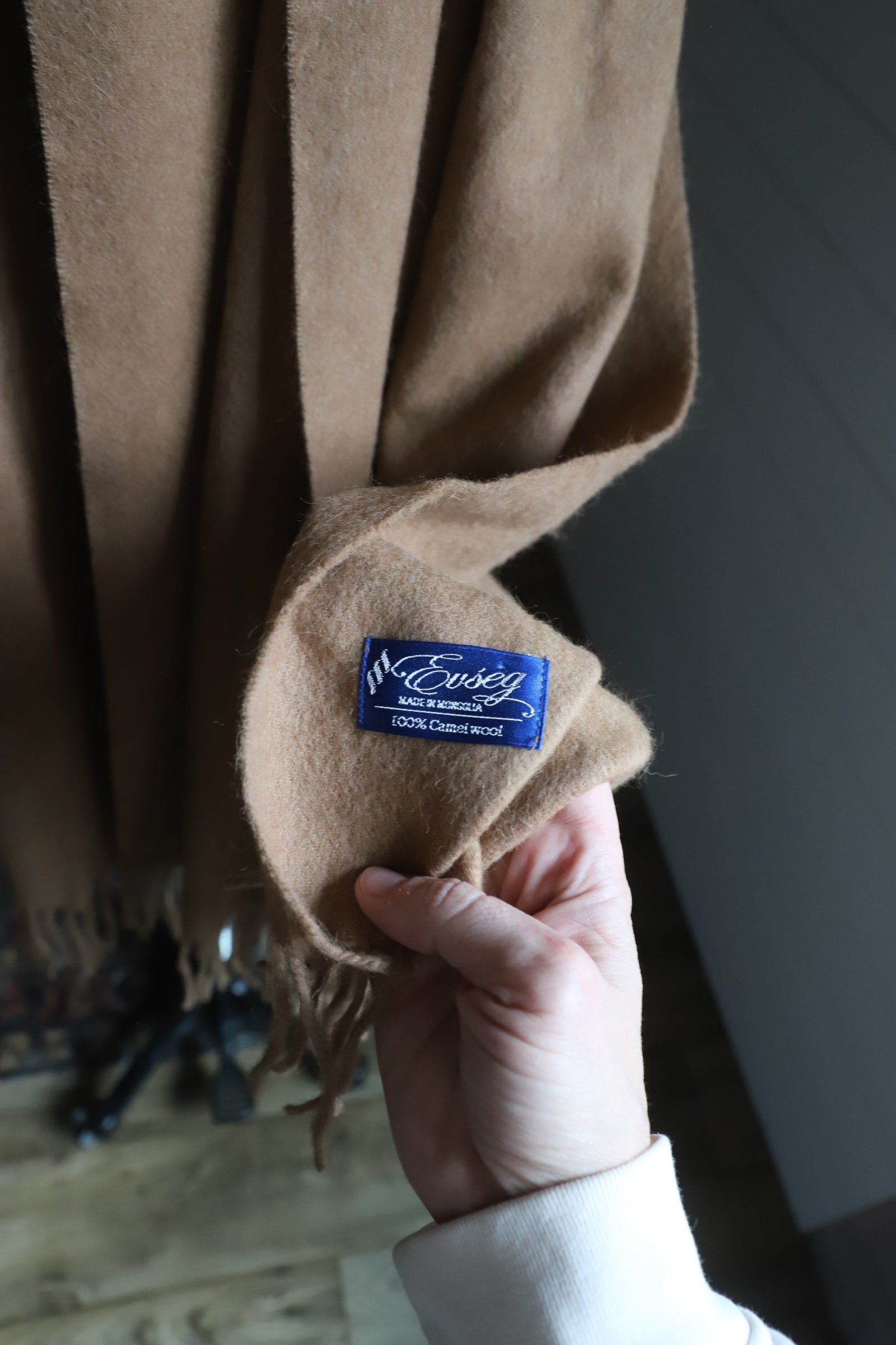 Beautiful 100% camel hair wool blanket scarf. Brand is Evseg. Made in Mongolia. This is in excellent condition besides one small, pin hole (see picture)