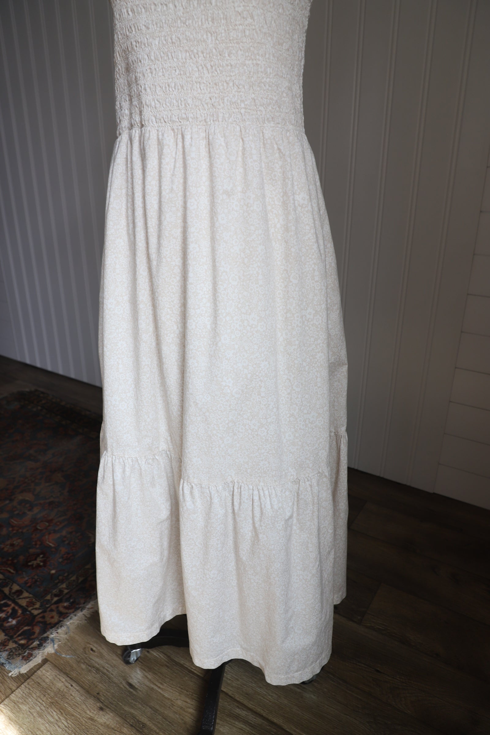 Beige floral 100% cotton Everlane dress. Stretch around the top but the material itself is a soft cotton with no stretch. Lined through the skirt. HAS POCKETS!! Washed and ready to wear. Retails for $148.