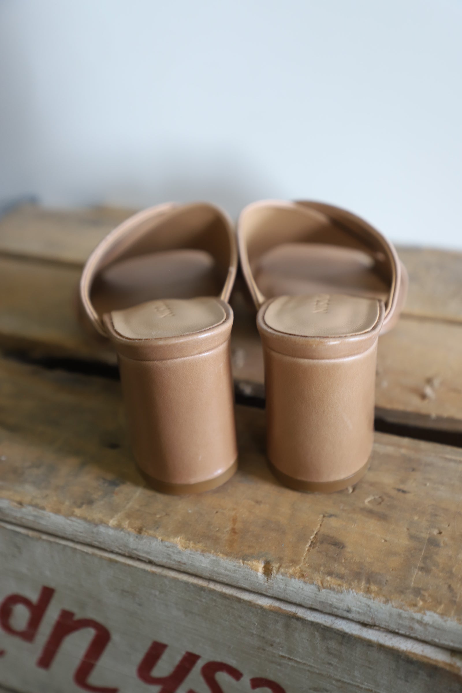 Beautiful Carina cross strap sandal in almond color. There is some scratching on the left top heel but I can use some conditioner to help that. They are new in box and retail for $180.