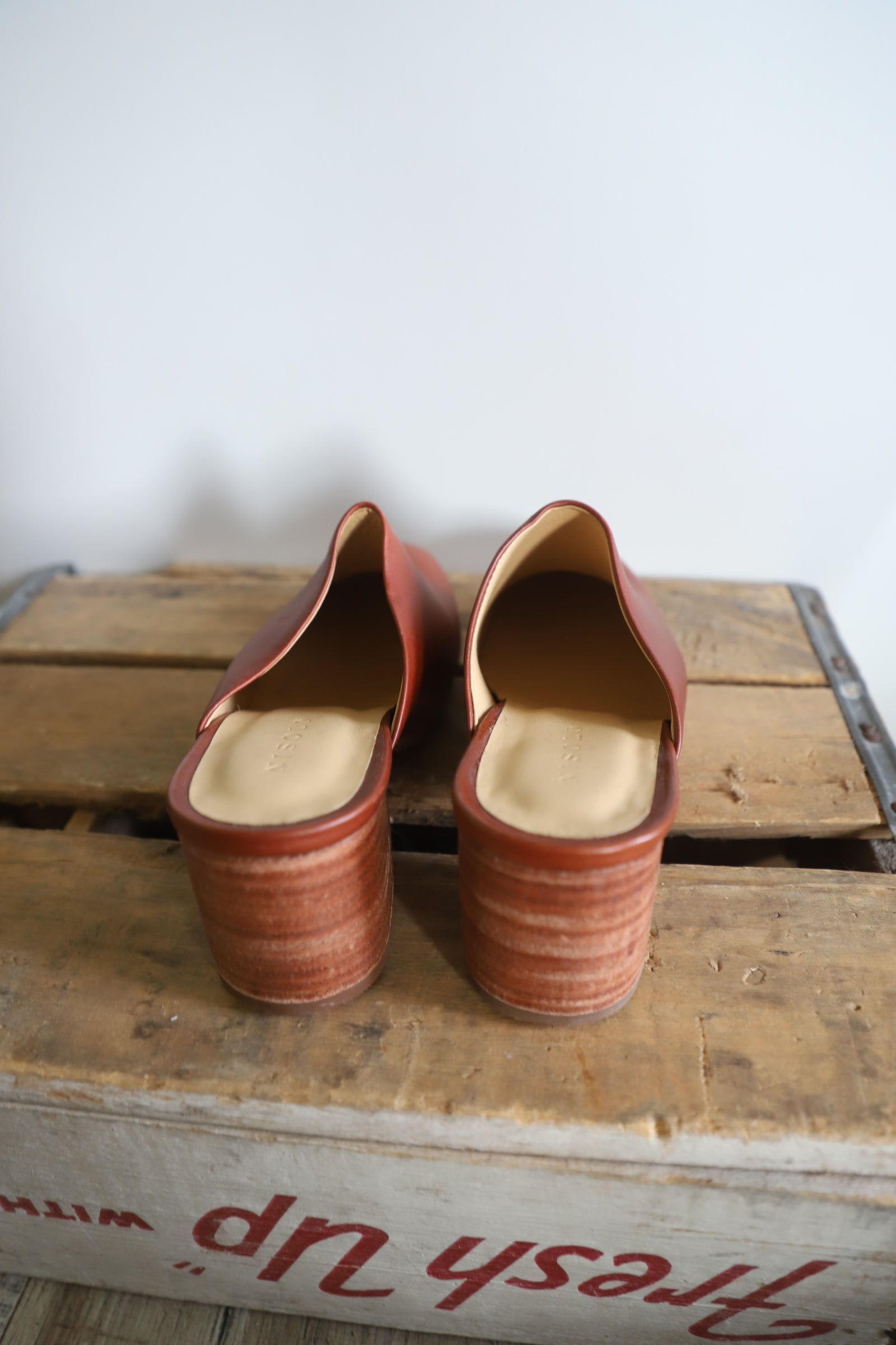Gorgeous Nisolo IN BOX mules, all leather with a rubber outer sole. Beautiful brandy color.