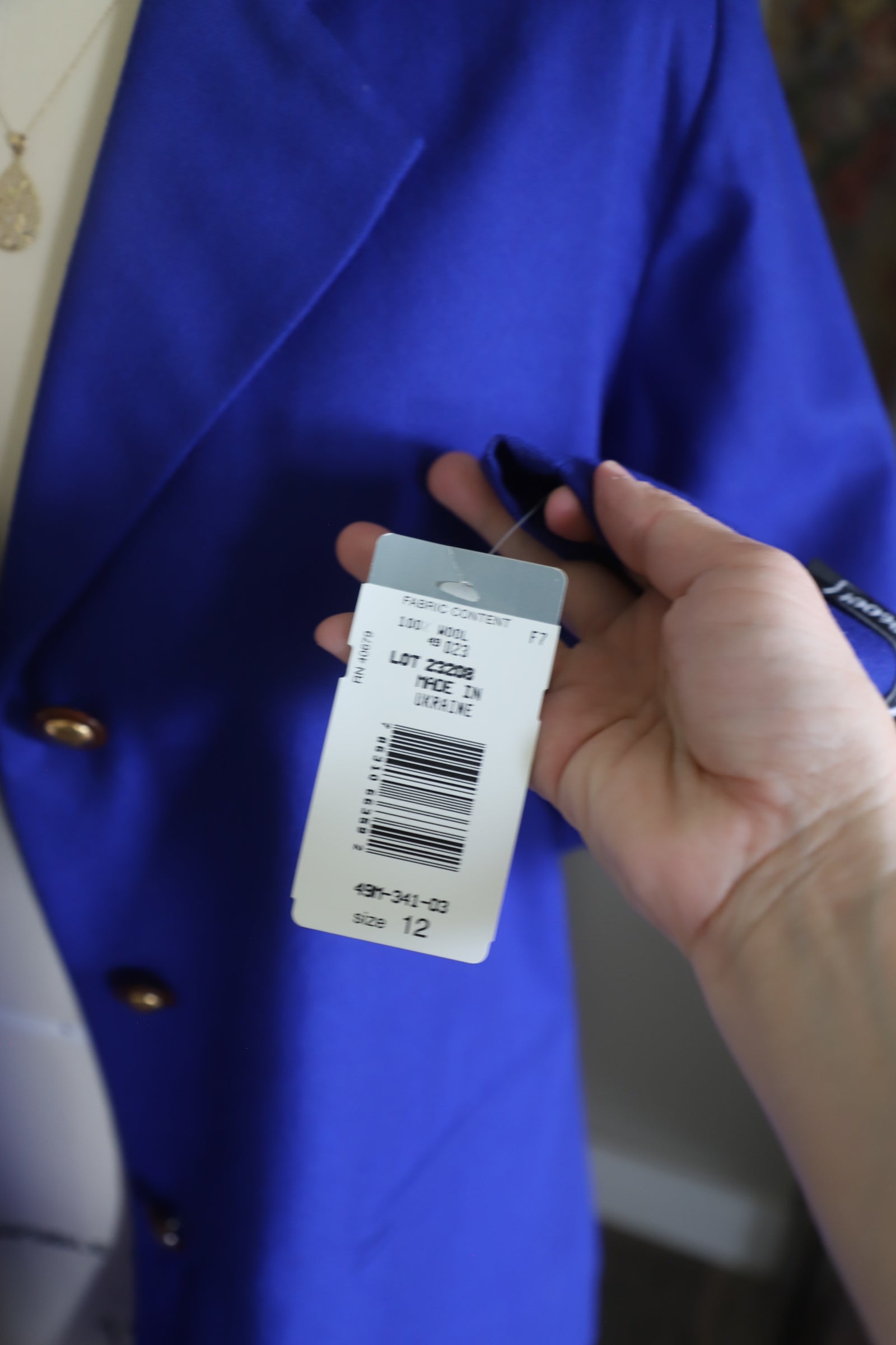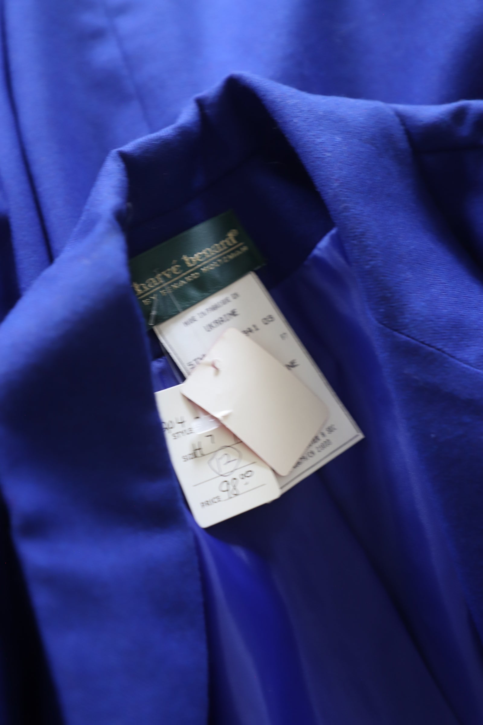 Gorgeous vintage dead stock (original tags attached) 100% wool blazer. Harvé Bernard. Beautiful jewel toned blue color with tortoise and gold buttons.