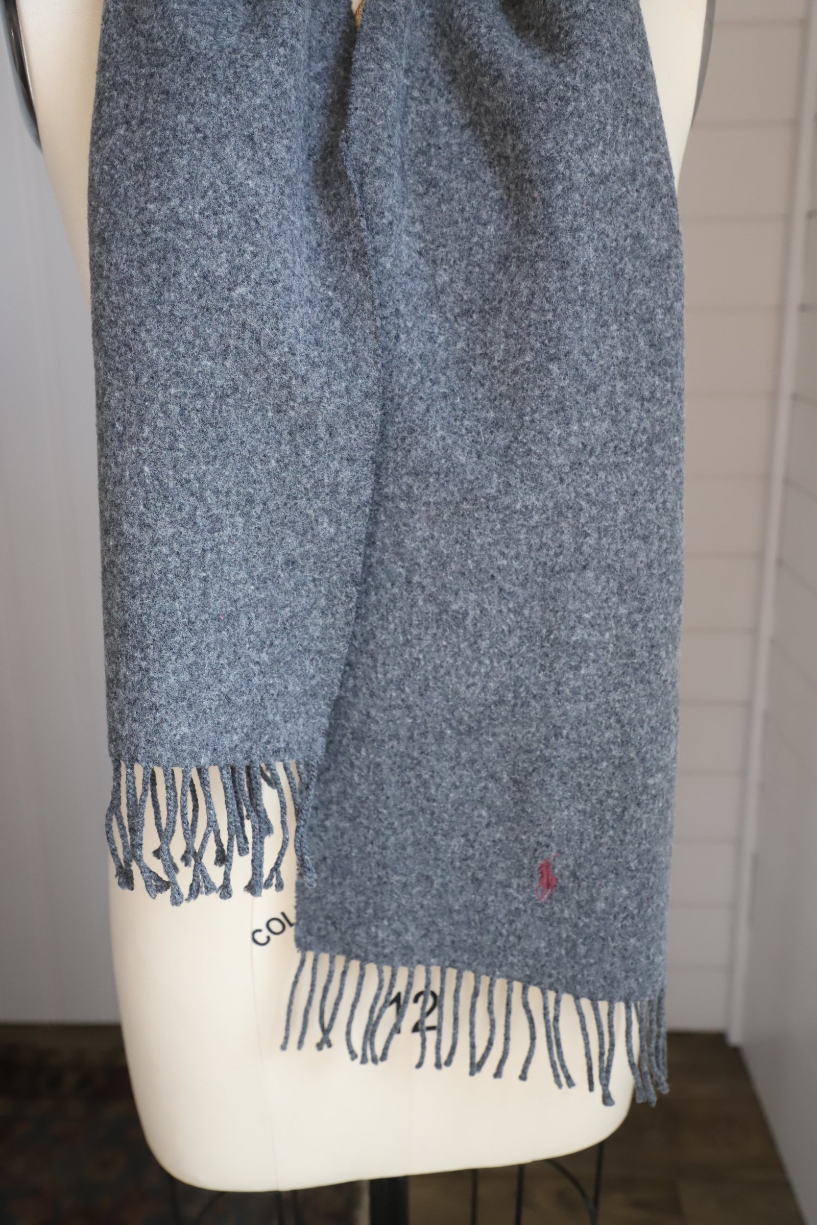 Charcoal grey polo Ralph Lauren scarf with a maroon embroidered horse rider. No fabric tags, feels like a soft wool or wool blend.