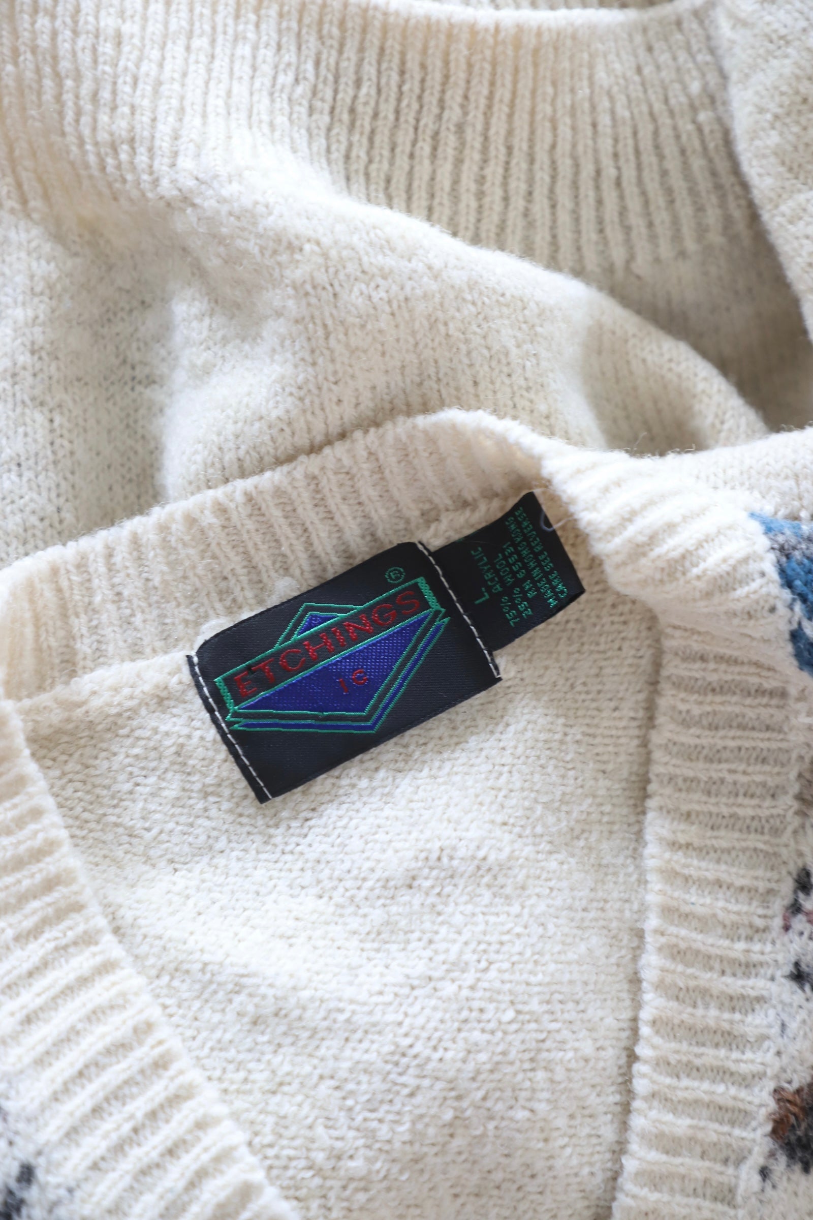 Vintage Etchings brand sweater vest. Cream base with muted colors and browns. So good!!!! Excellent, vintage condition. 75% acrylic 25% wool.