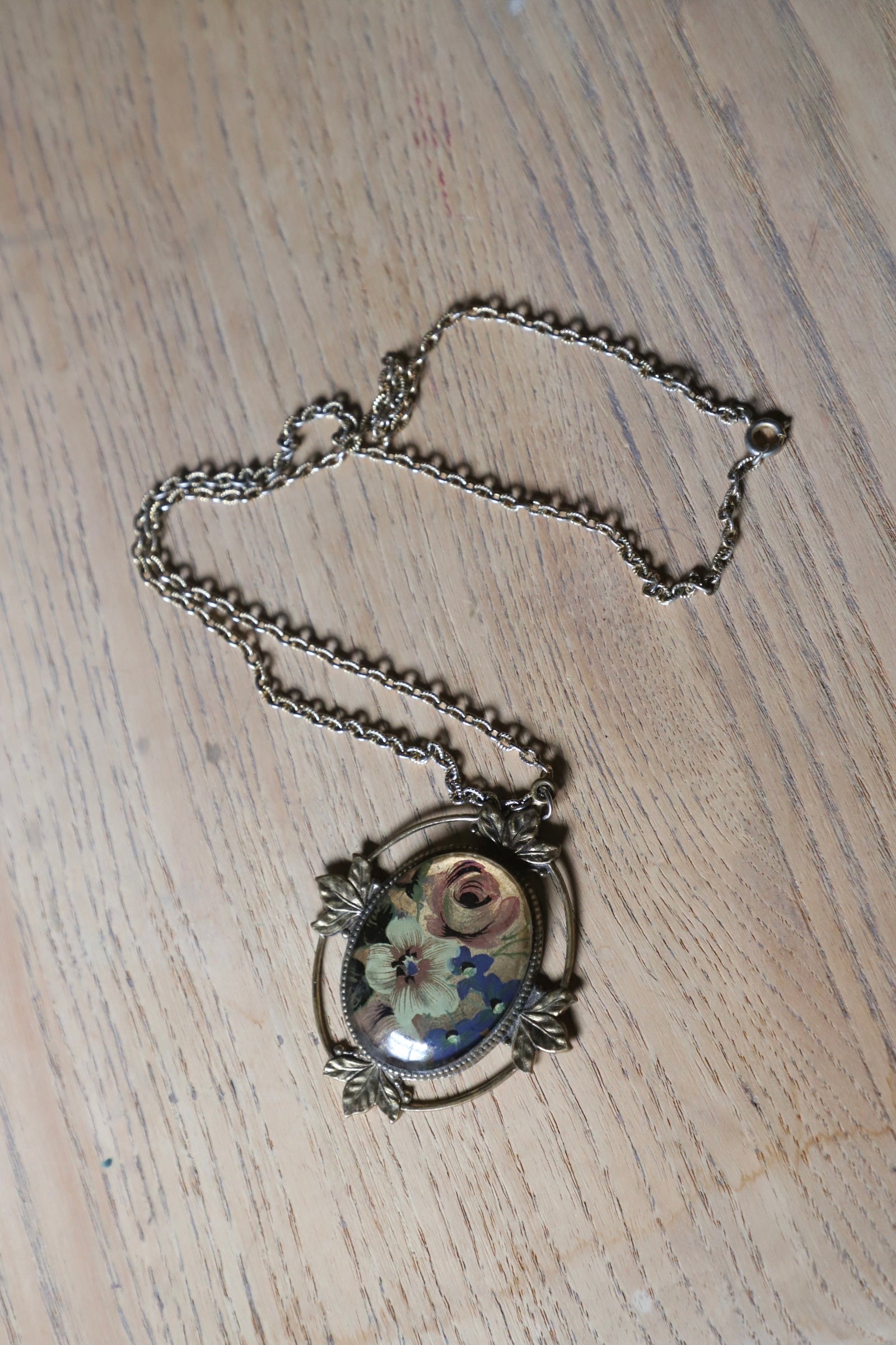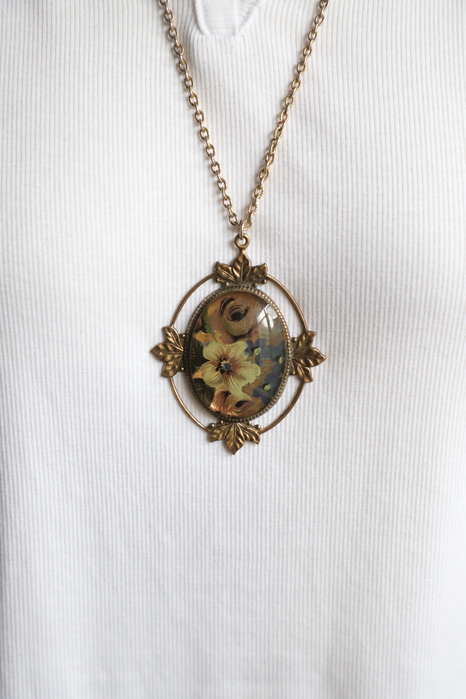 Beautiful brass detailed floral pendant necklace. This has patina and is beautiful. The necklace has some color loss itself but the pendant looks really nice. I think the necklace itself has character but could be an easy swap if you didn’t like it.