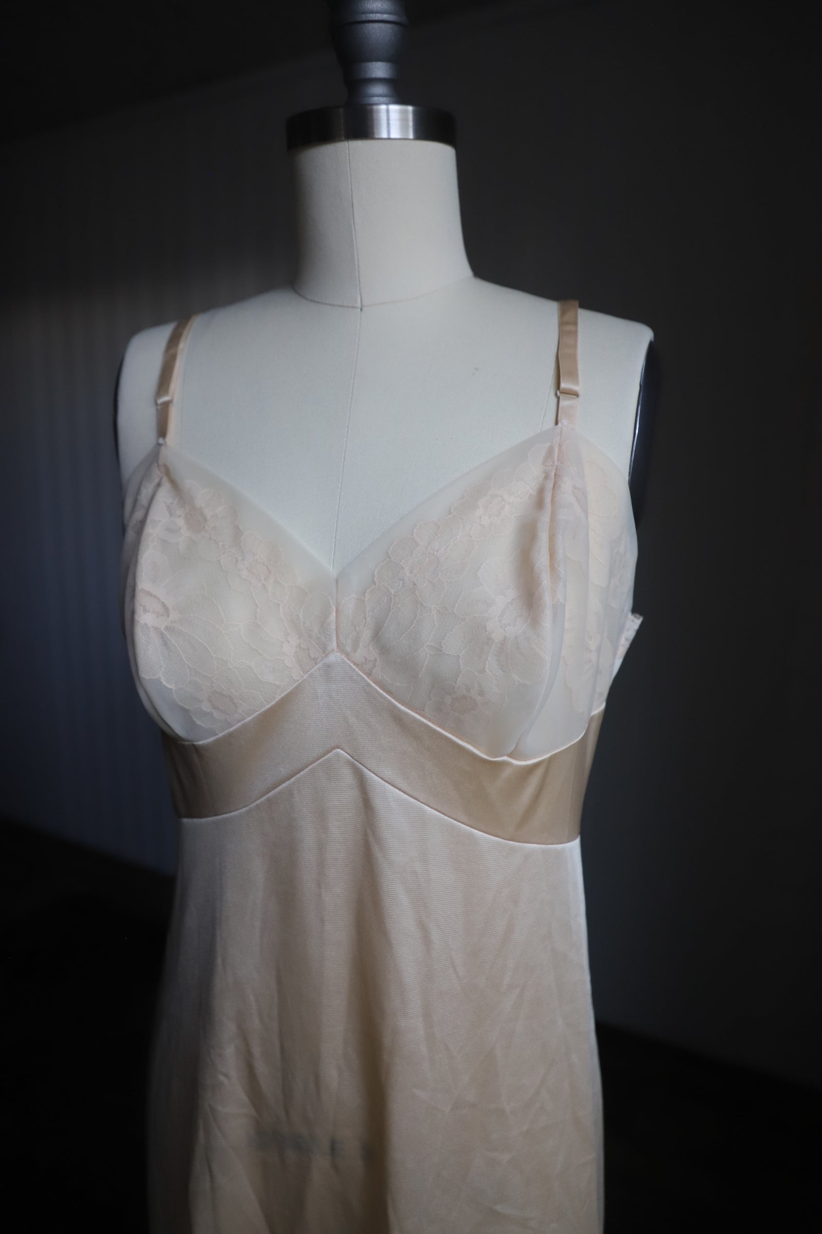 Gorgeous and romantic JCPenney vintage slip. I love the lace details in the bust and on the hem. Washed and ready to wear. Some very slight discoloration on the back. 100% nylon.
