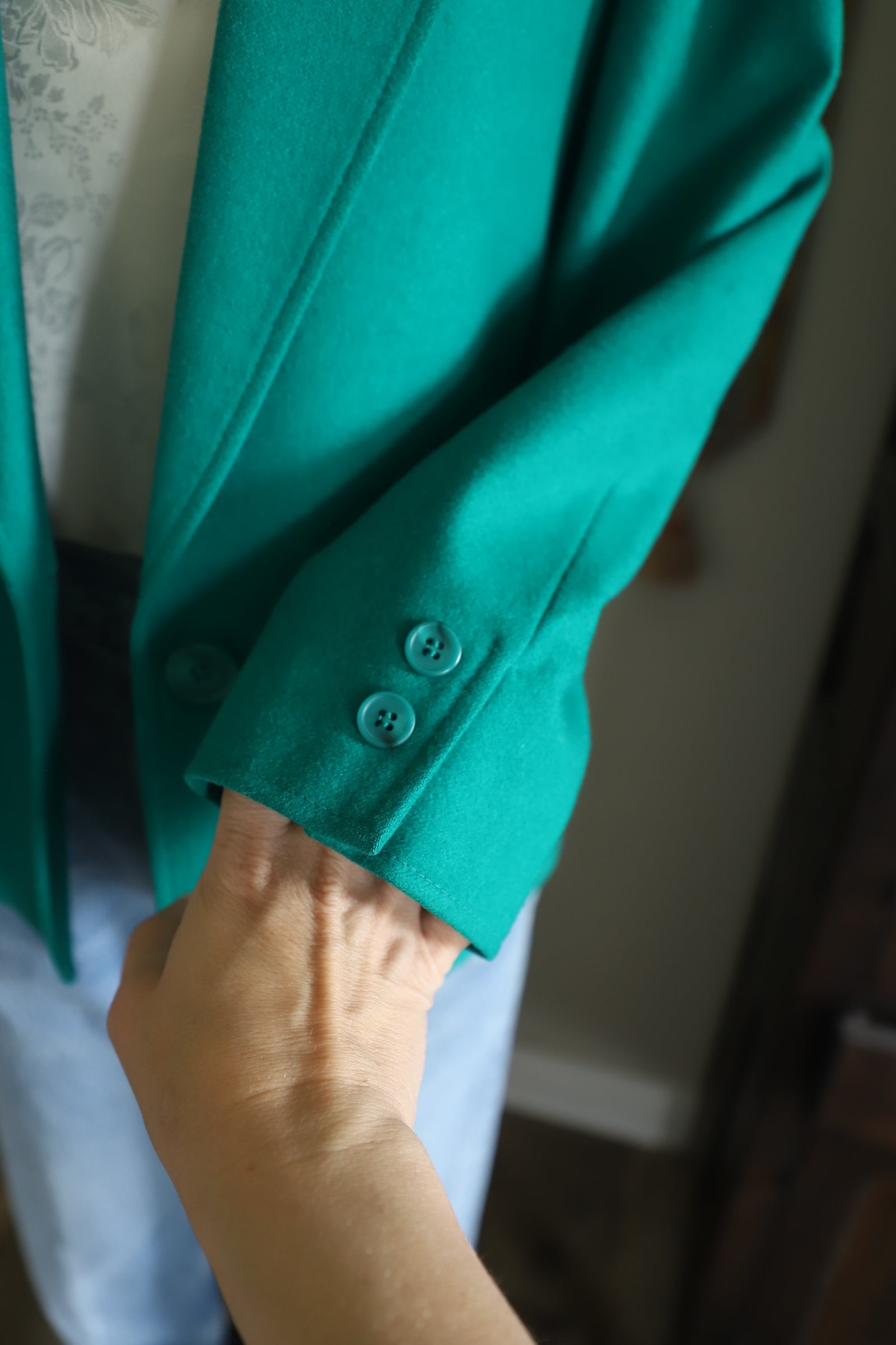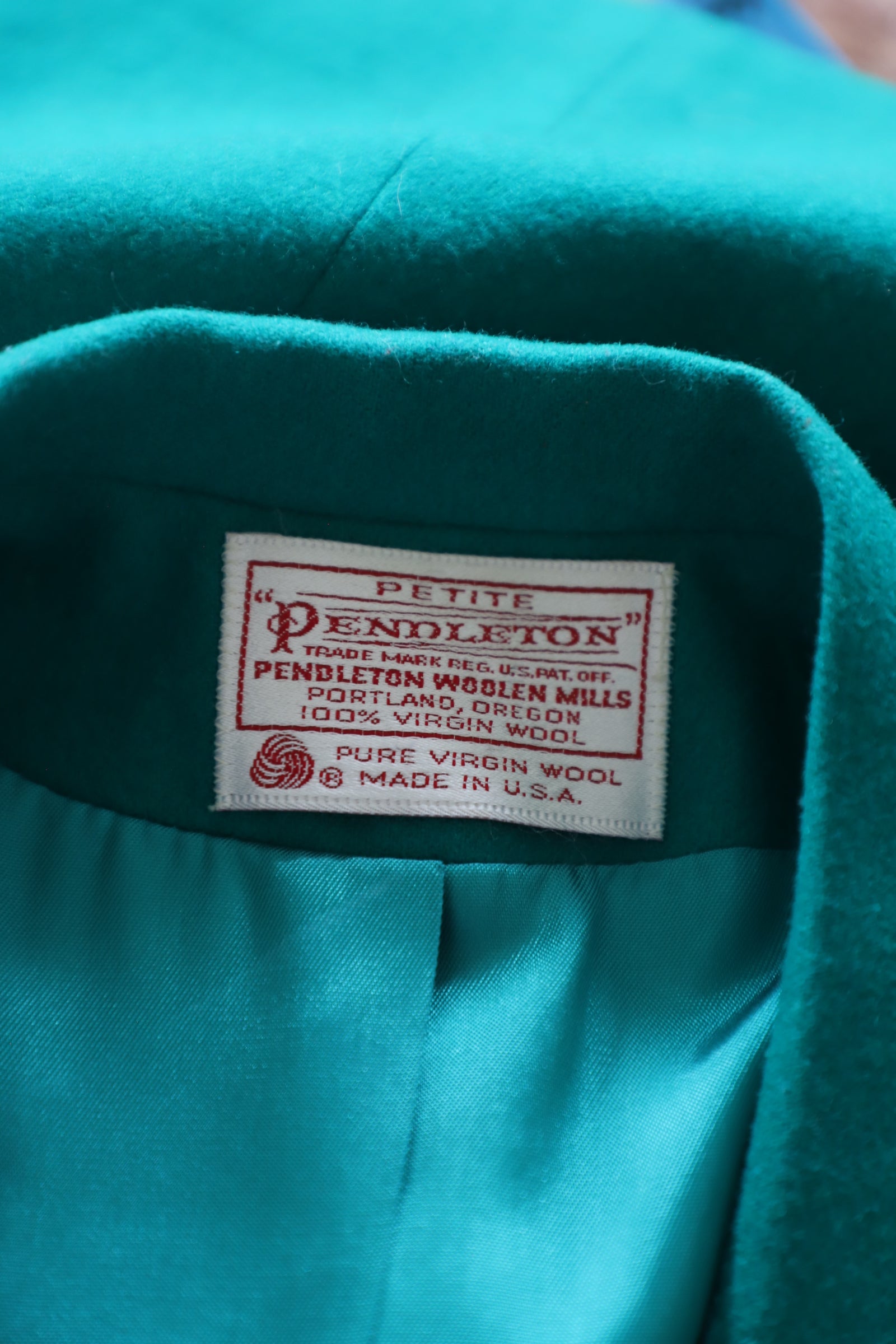 Gorgeous jewel toned green vintage Pendleton blazer. 100% pure virgin wool and made in the USA! Beautiful, vintage condition. I steamed this inside and out and gave it a vodka sprits to sanitize.