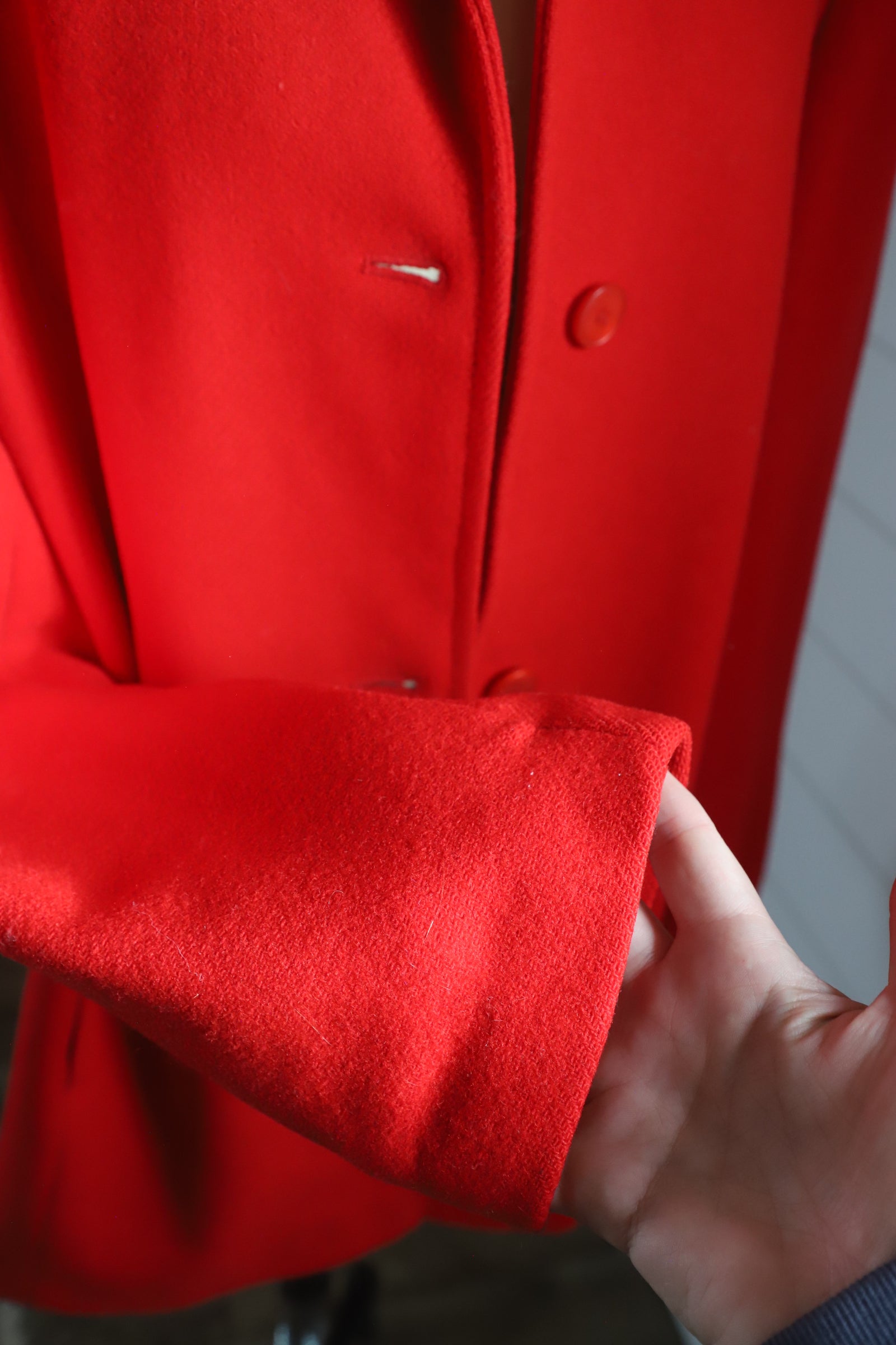 Vintage Pendleton 100% pure new wool, made in USA. The prettiest bright red color. This is in good, used condition. Has some wear on the edges all over. A couple of very minor and light stains. (One on left sleeve, one on back.) It is fully lined. Size has been cut out.
