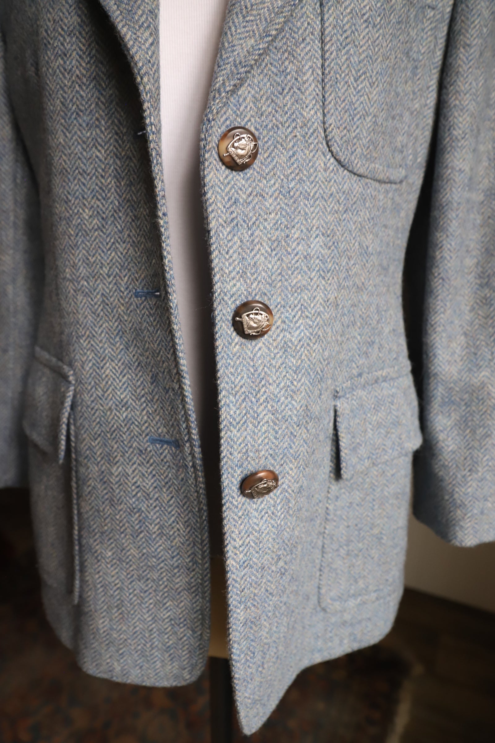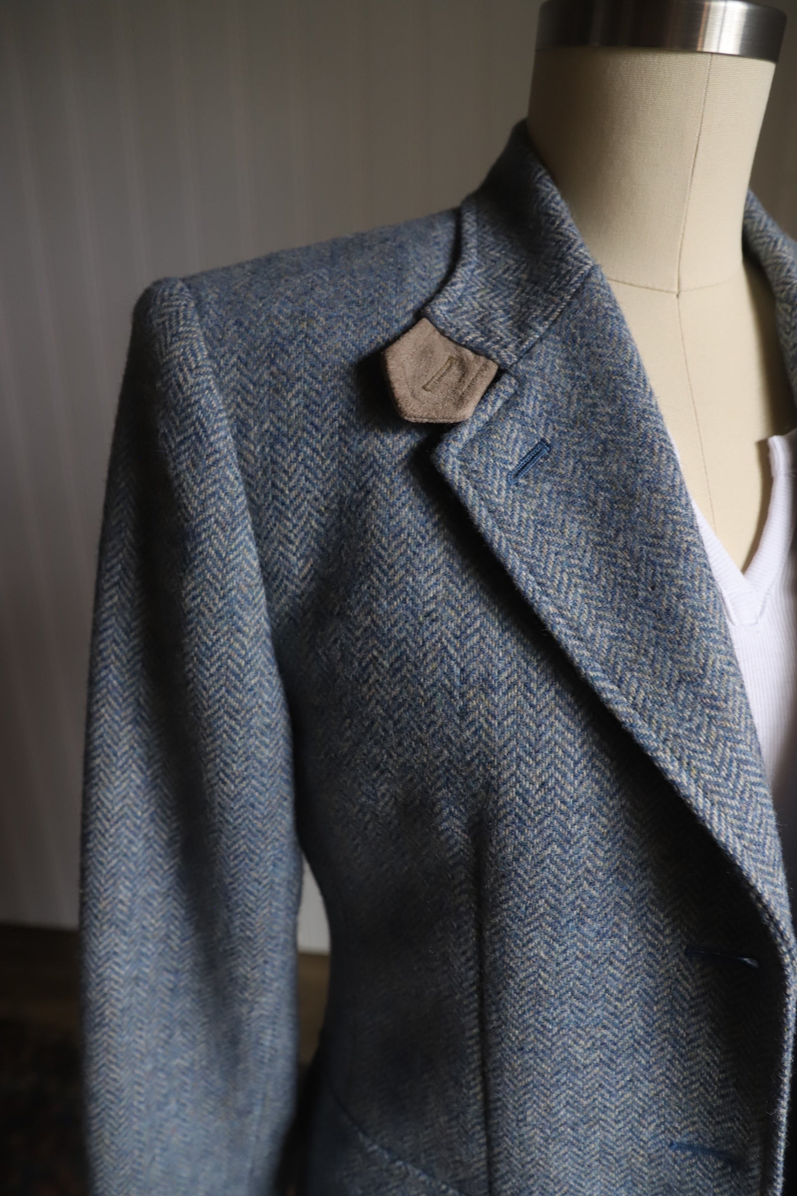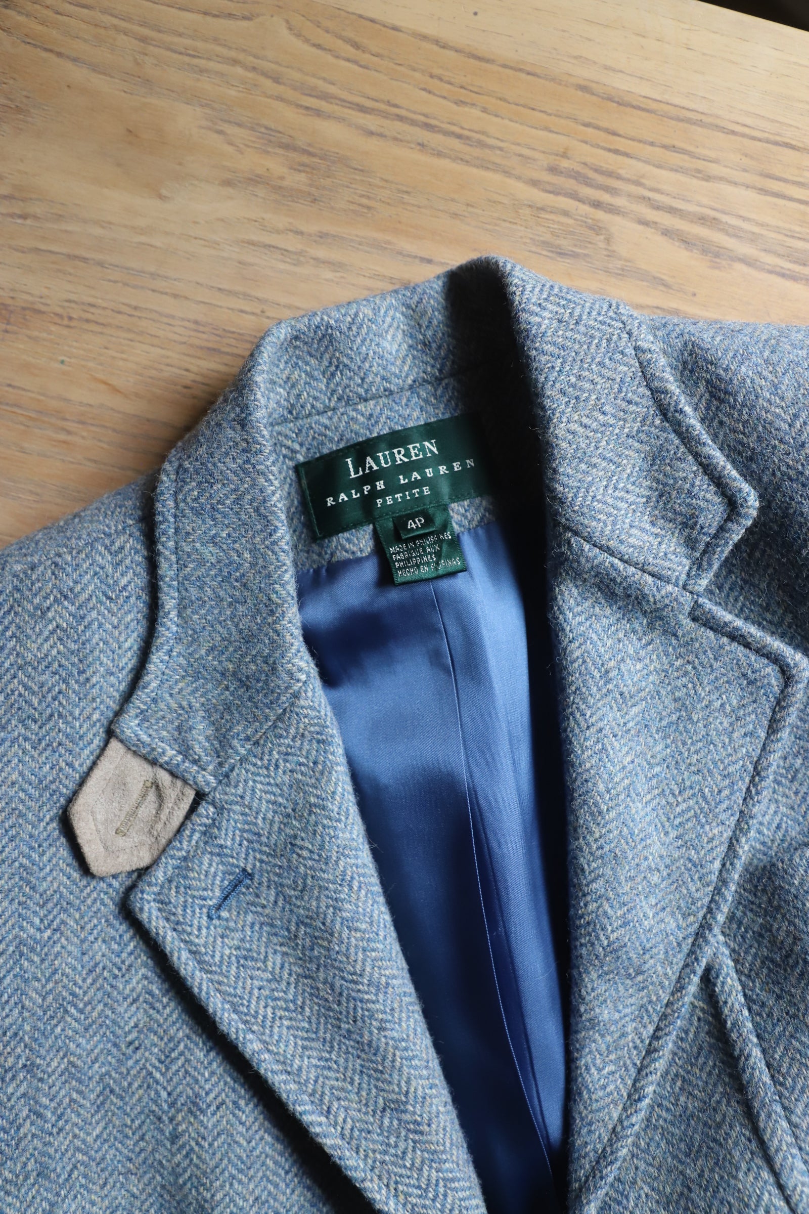 Absolutely beautiful vintage Lauren Ralph Lauren blue tweed blazer with read suede details on the lapel and the elbows. It’s a muted French blue color. I stood in line to get into an estate sale early just to get this blazer. It’s so special! Overall good, vintage condition. 100% lambswool, with 100% leather detailing and lined in 100% acetate. Made in the Philippines. Horse buttons!!! It’s so so good.