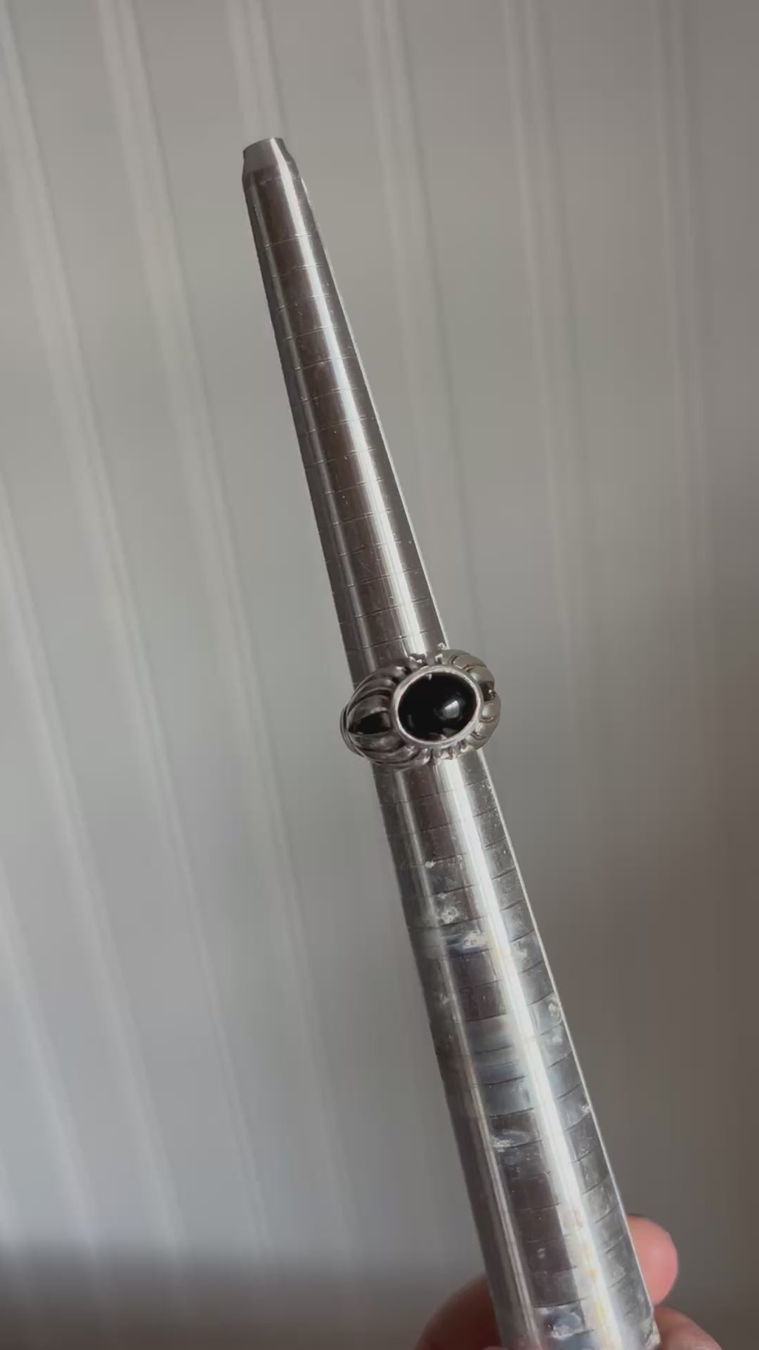 Beautiful and heavy duty onyx and sterling silver ring. Sized in my sizer at an 8. See photo. Recently cleaned and a beautiful, heirloom piece.