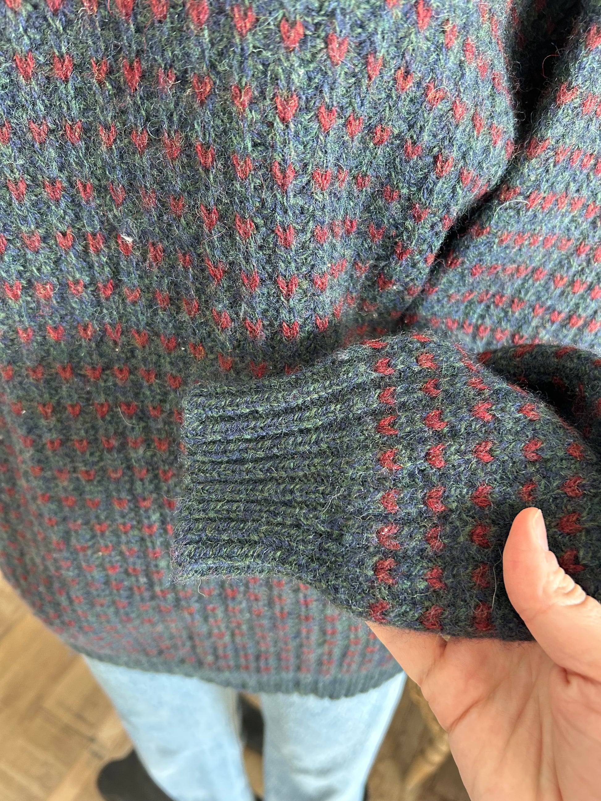 Gorgeous vintage Woolrich sweater. This has a mix of green, blue, and maroon. Absolutely stunning. This has a couple of very well done mended spots. It’s been washed and is ready to wear. No fabric tags but it’s for sure wool and if you’re sensitive to wool, this is not for you.