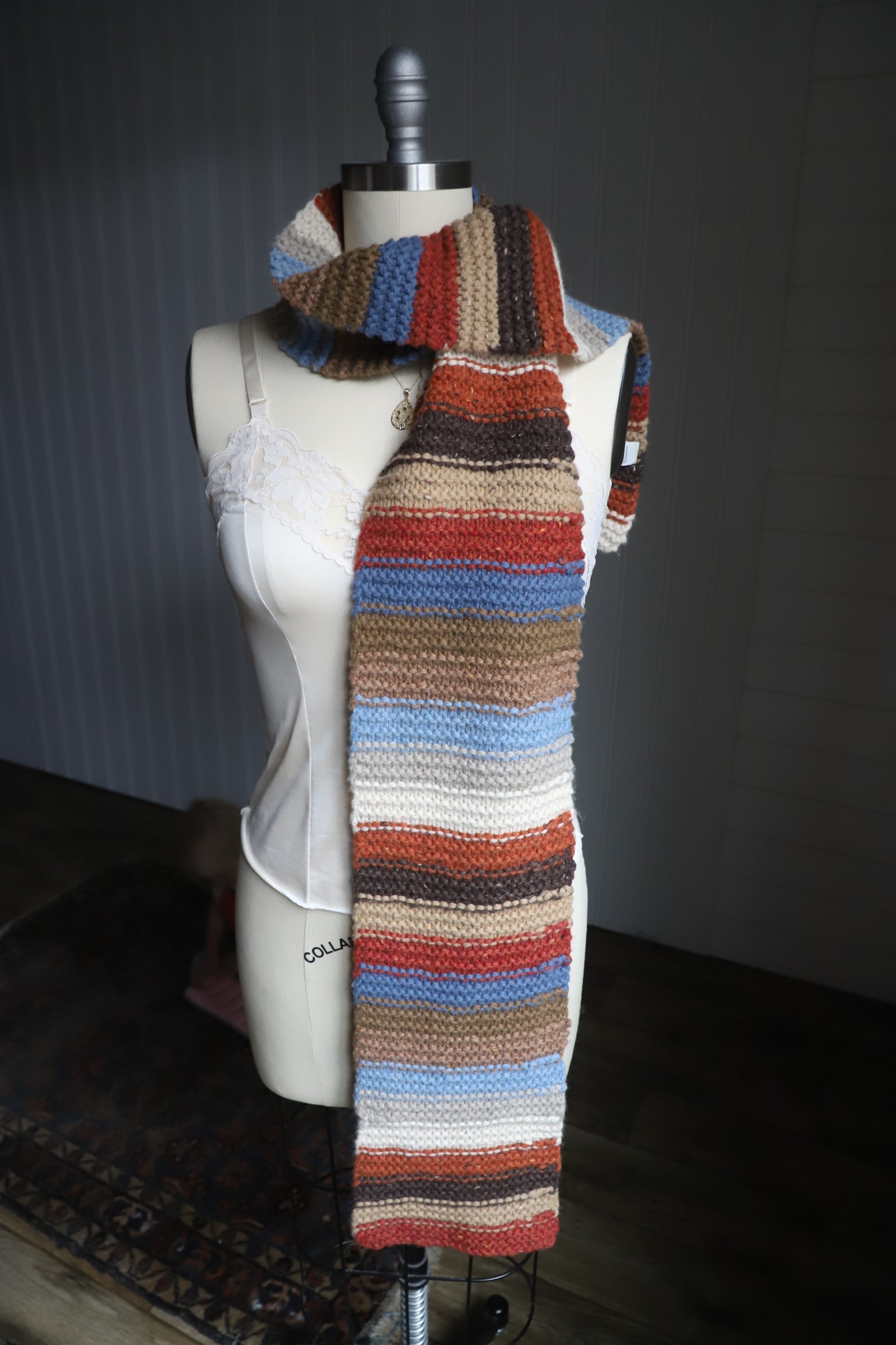 Can you believe that old navy used to actually use wool in their products? This scarf is from 2004, 69% lambswool 23% nylon 8% acrylic. Gorgeous colors for fall and winter. A good, long size to wrap a couple times if you want!